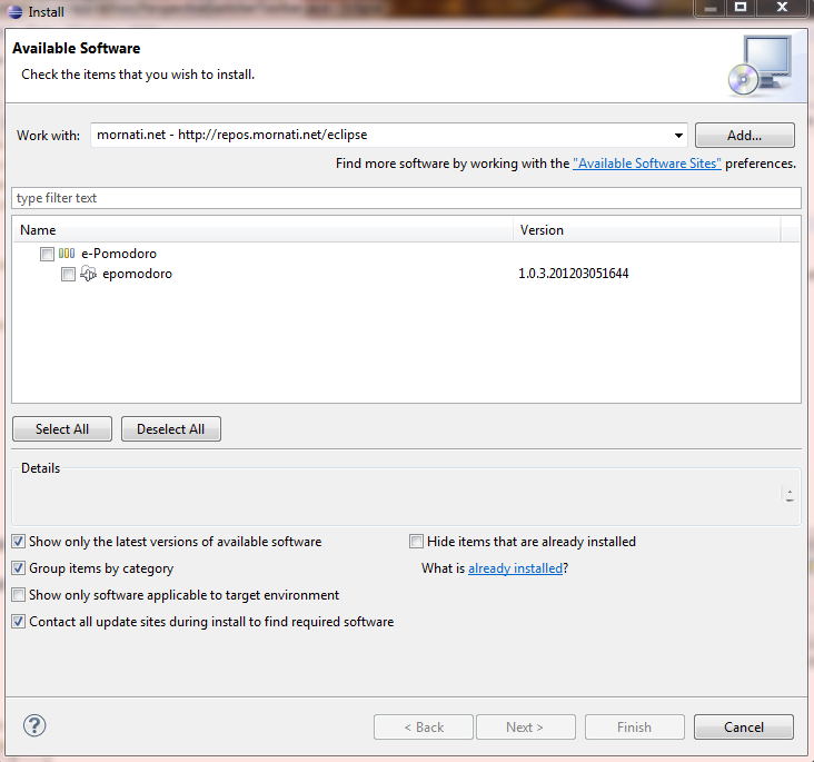 You can add this Update Site: http://repos.mornati.net/eclipse/ and select ePomodoro.Should work, even if at the moment you get a message saying the content is not signed, bla, bla, bla. I'll fix it next days, but let me know if you can install ePomodoro without problems.