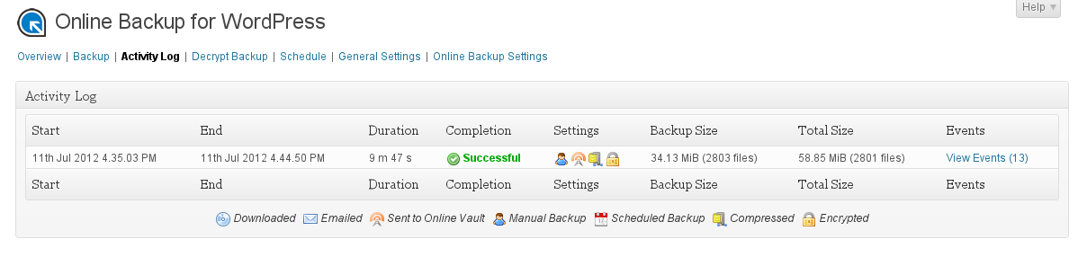 You have just some little steps to configure it: define a schedule for you backup, choosing if you want a full or an incremental backup (the incremental is available just if you select Online backup), setup you online account (optional), define the encryption method and password (optional) and that's all. Yes, we need to create another account for a free online service, but why not? We give our personal information to any kind of supermarket and we almost have nothing back (just a bit of spam). The link for the account registration is directly proposed by plugin and you will have (with the free account) 100mb to use to backup your wordpress (or more than one) blog. And now you can test a manual backup (using the link in the backup menu) to check if all your settings are good. If you will have any kind of problem you can login into Wordpress Online Backup website, give your encryption password and download your full backup (files + database). The backup will not offer a wordpress migration too, but I tested it by hand today, you can edit your sql file and replace all http address in the file with the new one, and wordpress will works without problems!! :)Take care of your blog, keep it backupped :D